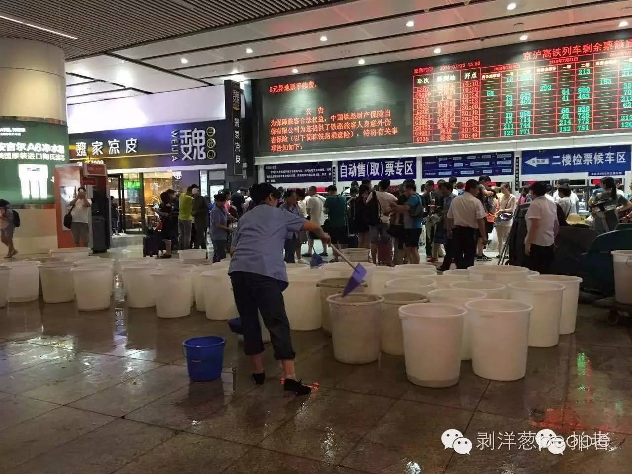 丰台区北京南站。20日14时左右,车站一楼的自动售票处漏水,工作人员拿了几十个桶接水,清理现场。此外,有站内商店因漏水暂时停业。新京报记者王飞 摄